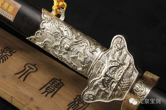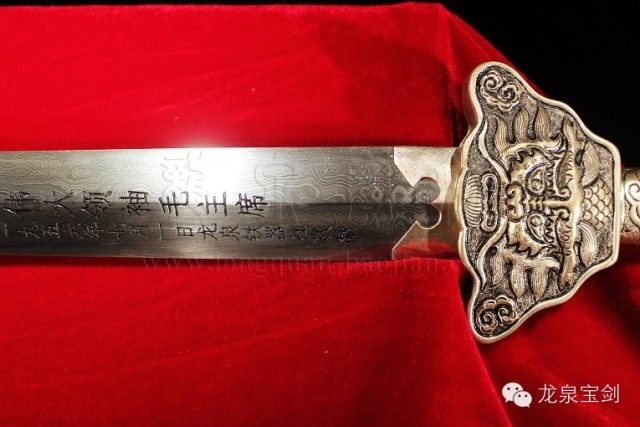 老师傅们选择了优质材料,千锤百炼,精心制作终于炼制出一把3尺龙泉宝剑,剑身镌刻着“献给伟大领袖毛主席”9个正楷字及北斗七星和龙凤吉祥图案。剑鞘选用上等花榈木,剑柄选用完整的牛角,如意形的护手上,雕刻着对称的虎头,剑鞘的银饰上镂刻衬叶牡丹花、鞘口上节用白银镶嵌对称的双龙戏珠,全是凸花浮雕,柄端系着一对橙红的丝绦。