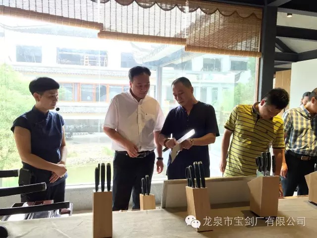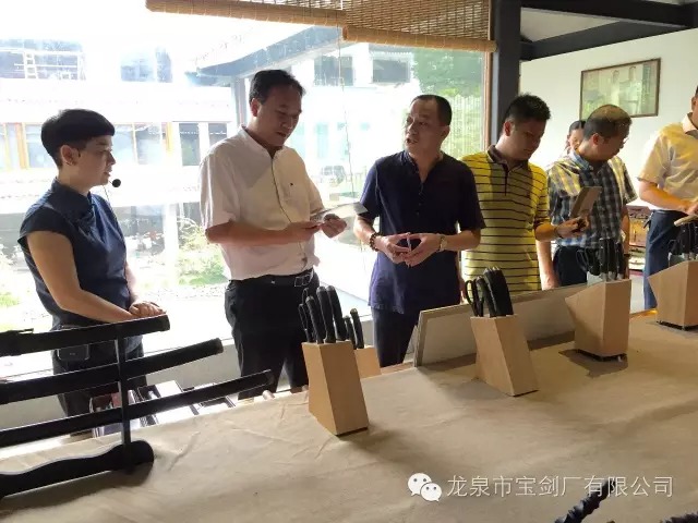 龙泉宝剑厂张叶胜大师向市委吴松平副书记介绍公司新开发的厨刀系列产品,并展示产品工艺及其锋利度。